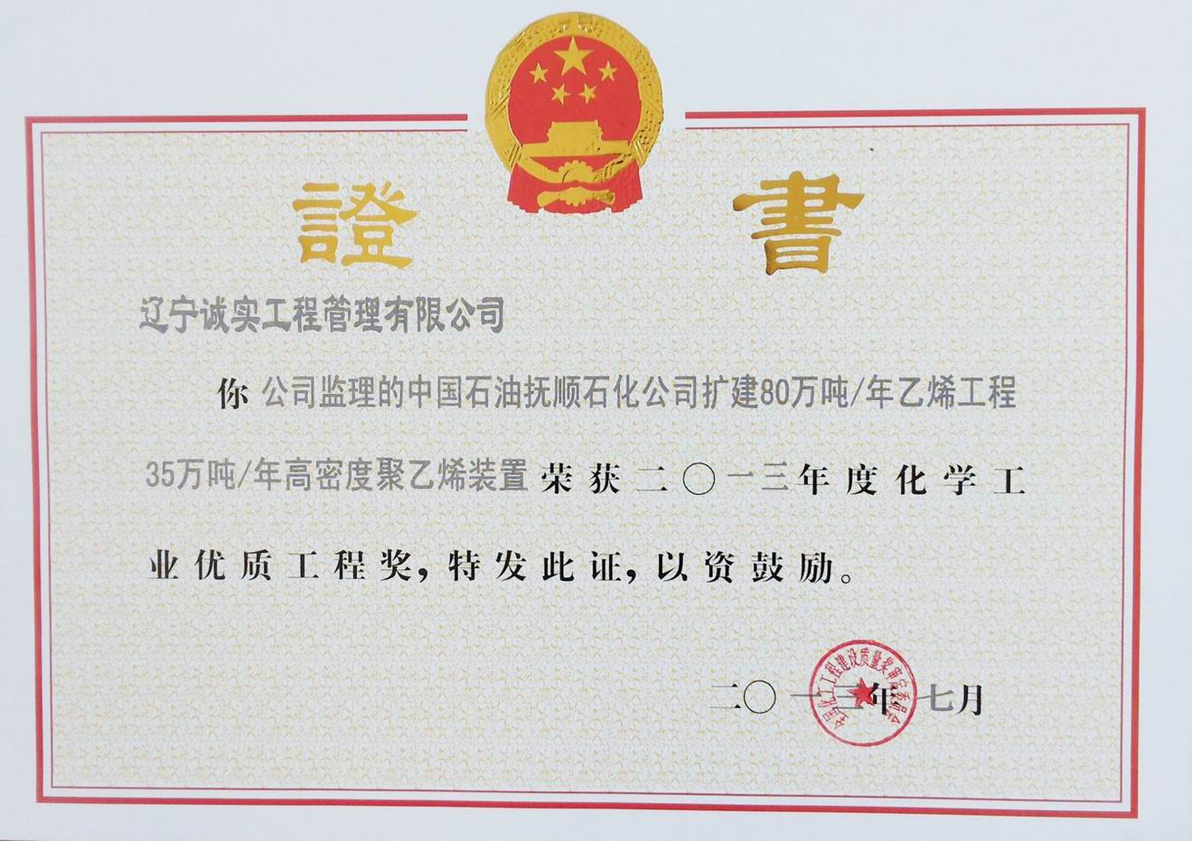 2013年化學(xué)工業(yè)優(yōu)質(zhì)工程獎(撫順石...