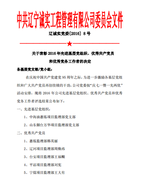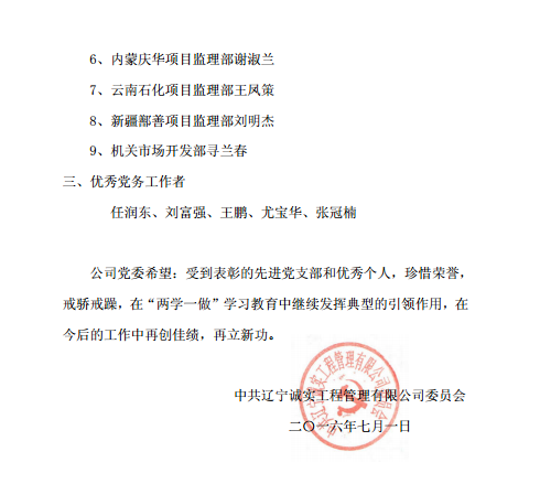 7月1日下午,公司黨委召開《慶祝建黨95周年暨“一優(yōu)兩先”表彰視頻大會》。主會場設(shè)在公司一樓會議室,中海油惠州項目監(jiān)理部黨支部、甘肅華亭項目監(jiān)理部黨支部、神華寧煤項目監(jiān)理部黨支部、煙臺萬華項目監(jiān)理部黨支部設(shè)立視頻分會場。黨委副書記馮玉琢主持了視頻大會。首先為新黨員中海油惠州項目監(jiān)理部黨支部的李婷婷舉行了入黨宣誓儀式,公司黨委委員劉興善同志宣讀了公司黨委對戰(zhàn)勝、吳琪轉(zhuǎn)為中共正式黨員的批復(fù)。公司黨委委員馬俊同志宣讀了“一優(yōu)兩先”表彰決定。黨委書記孫學(xué)良結(jié)合公司實(shí)際做了慶祝建黨95周年的講話。最后全體黨員重溫的入黨誓詞,進(jìn)行入黨宣誓。