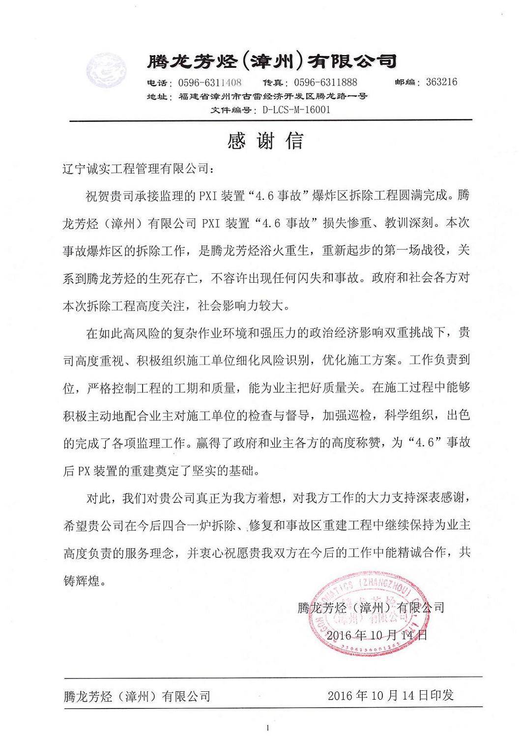 我公司監(jiān)理人員在“騰龍芳烴(漳州)有限公司PXI裝置4.6事故爆炸區(qū)拆除”工程監(jiān)理服務(wù)工作中,得到了業(yè)主單位的認(rèn)可和肯定,對(duì)我們的工作表示十分滿意,特發(fā)感謝信提出表?yè)P(yáng)。