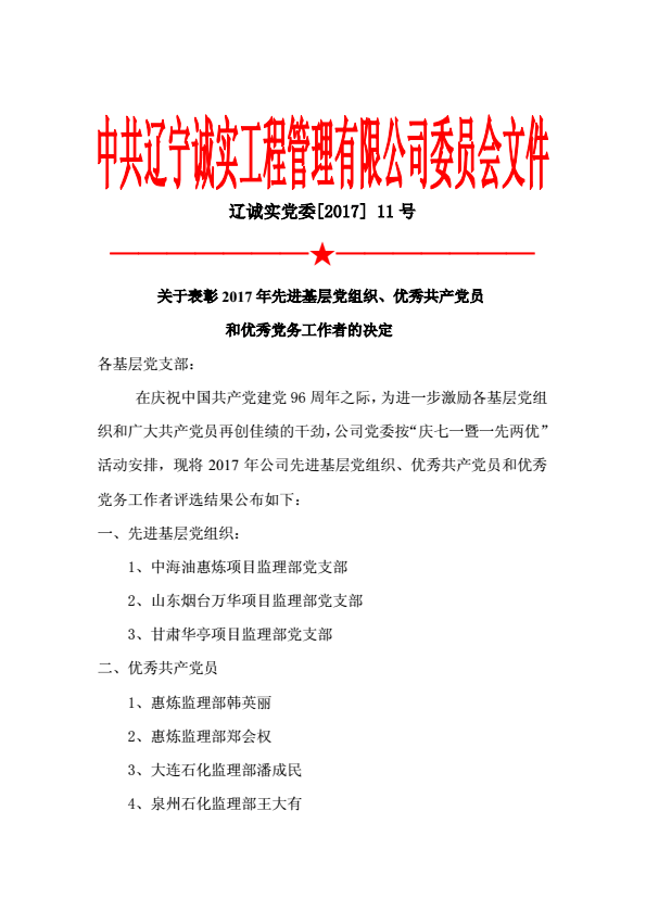 為慶祝中國共產(chǎn)黨建黨96周年,公司黨委于2017年6月30日下午在公司一樓會議室召開了慶祝建黨96周年暨“一優(yōu)兩先”表彰視頻大會。公司機(jī)關(guān)、撫順各項目監(jiān)理部及在撫的黨員同志在主會場參加了大會,中海油惠州項目監(jiān)理部黨支部、甘肅華亭項目監(jiān)理部黨支部、寧夏石化項目監(jiān)理部黨支部、中化泉州項目監(jiān)理部黨支部、廣西石化項目監(jiān)理部黨支部、蘭州石化項目監(jiān)理部黨支部、內(nèi)蒙古君正項目監(jiān)理部黨支部、神華寧煤項目監(jiān)理部黨支部、煙臺萬華項目監(jiān)理部黨支部設(shè)立視頻分會場。黨委委員馬駿主持了視頻大會。首先,公司黨委副書記馮玉琢同志宣讀了“一優(yōu)兩先”表彰決定。接著,黨委書記孫學(xué)良結(jié)合公司實際做了慶祝建黨96周年的講話。最后全體黨員重溫的入黨誓詞,進(jìn)行入黨宣誓。