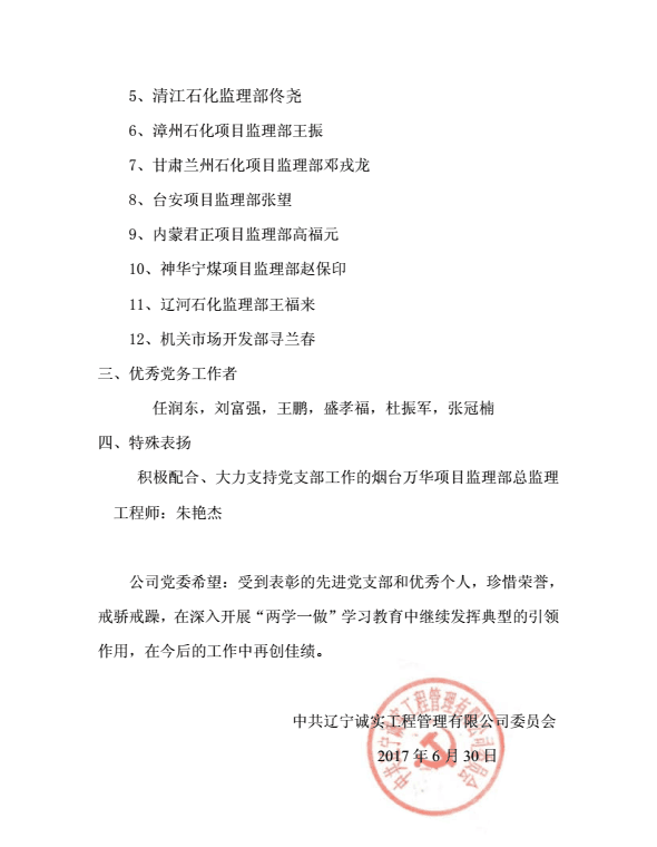 為慶祝中國共產(chǎn)黨建黨96周年,公司黨委于2017年6月30日下午在公司一樓會議室召開了慶祝建黨96周年暨“一優(yōu)兩先”表彰視頻大會。公司機關、撫順各項目監(jiān)理部及在撫的黨員同志在主會場參加了大會,中海油惠州項目監(jiān)理部黨支部、甘肅華亭項目監(jiān)理部黨支部、寧夏石化項目監(jiān)理部黨支部、中化泉州項目監(jiān)理部黨支部、廣西石化項目監(jiān)理部黨支部、蘭州石化項目監(jiān)理部黨支部、內(nèi)蒙古君正項目監(jiān)理部黨支部、神華寧煤項目監(jiān)理部黨支部、煙臺萬華項目監(jiān)理部黨支部設立視頻分會場。黨委委員馬駿主持了視頻大會。首先,公司黨委副書記馮玉琢同志宣讀了“一優(yōu)兩先”表彰決定。接著,黨委書記孫學良結(jié)合公司實際做了慶祝建黨96周年的講話。最后全體黨員重溫的入黨誓詞,進行入黨宣誓。