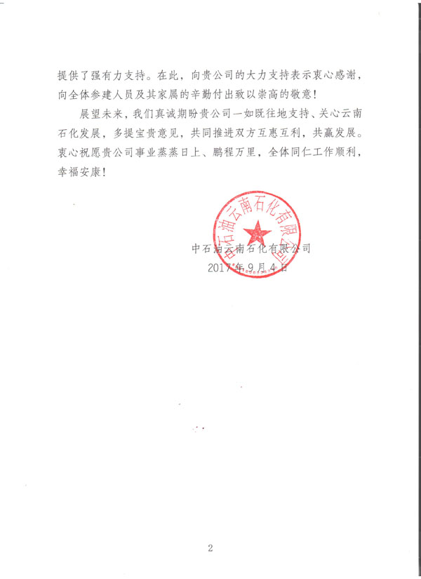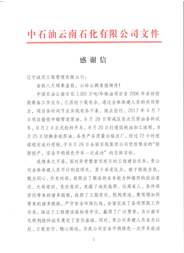 我公司于今日收到由中國石油云南石化有限公司發(fā)給我方的《感謝信》一封,信中提到:對于我方所監(jiān)理服務(wù)的煉油項(xiàng)目自2006年啟動籌備工作至今,我方監(jiān)理人員不計利益得失,勇于承受壓力,使得該項(xiàng)目近日順利投產(chǎn)試車成功。對于我單位的工作給予極大的肯定以及衷心的感謝。對方還提到:希望雙方在日后的共同發(fā)展中,互惠互利,共贏發(fā)展。