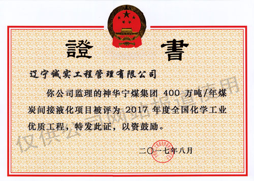 我單位所監(jiān)理的《神華寧煤集團(tuán)400萬(wàn)噸/年煤炭間接液化項(xiàng)目》被中國(guó)化學(xué)施工企業(yè)協(xié)會(huì)評(píng)為2017年度全國(guó)化學(xué)工業(yè)優(yōu)質(zhì)工程獎(jiǎng)。在此次評(píng)選中,共有81項(xiàng)工程、178個(gè)單位及156名突出貢獻(xiàn)者獲得表彰。此次,是我單位時(shí)隔4年第二次獲得該獎(jiǎng)項(xiàng)殊榮。