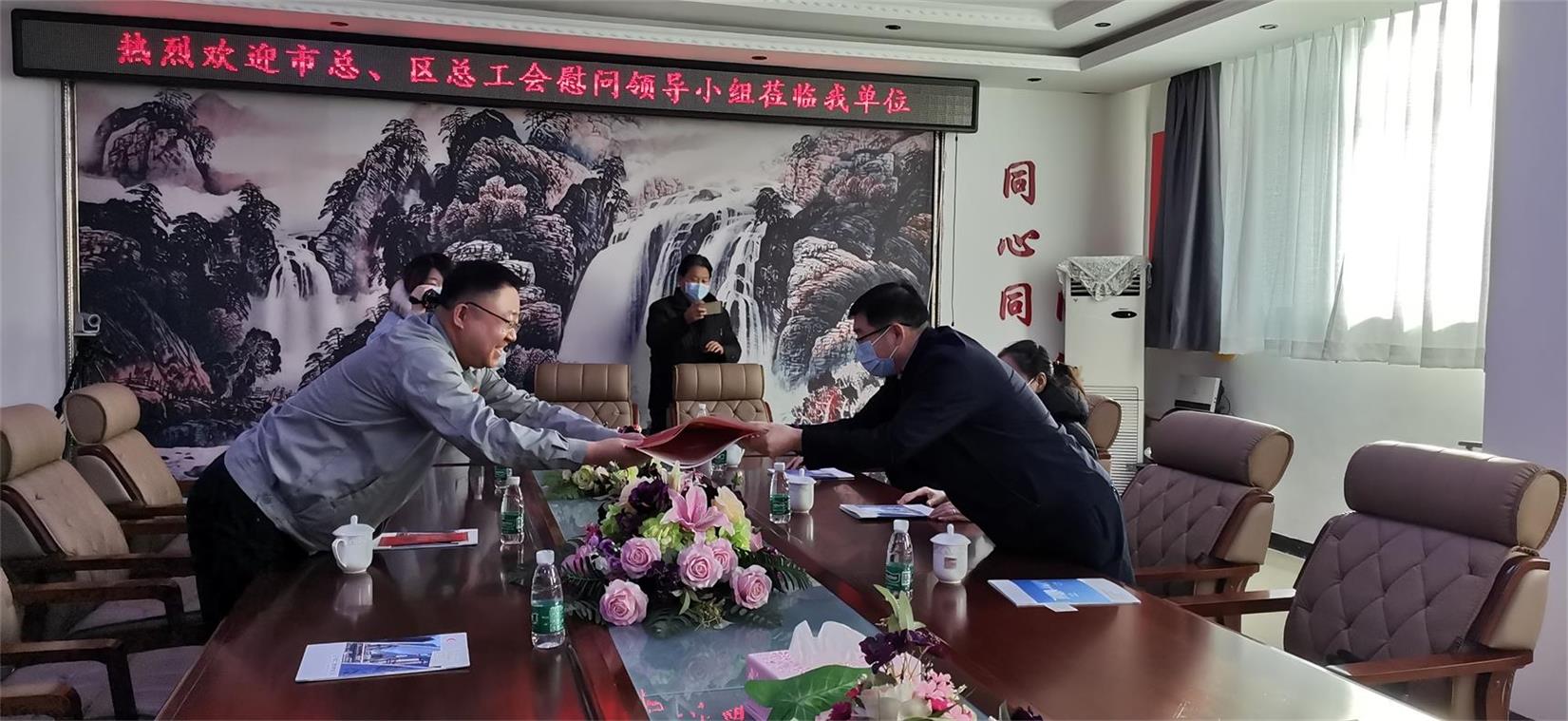 張主席聽完匯報后,首先肯定了我企業(yè)工會的日常工作,以及疫情爆發(fā)之初,我企業(yè)向社會作出的突出貢獻,并向我企業(yè)工會撥入送溫暖資金5萬元。最后,張主席還意味深長地說:感謝我企業(yè)在本行業(yè)的堅守,在本市的堅守。馬書記還在春節(jié)即將來臨之際,為企業(yè)贈送了春節(jié)對聯(lián)。
