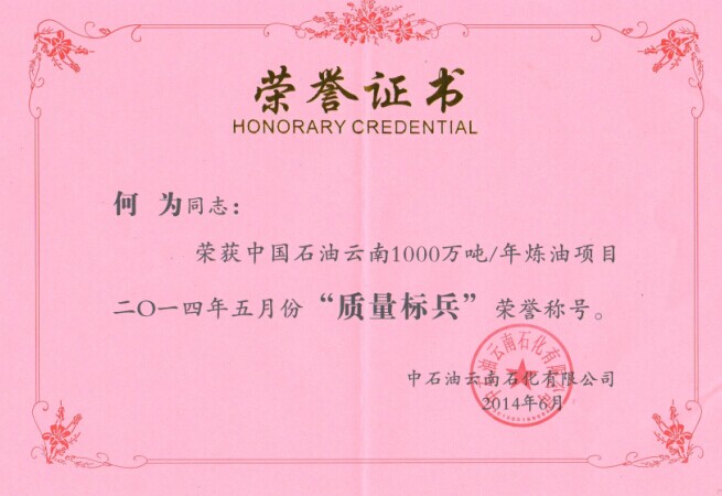 表彰:云南項(xiàng)目部何為同志榮獲中國石油云南1000萬噸/年煉油項(xiàng)目2014年5月份“質(zhì)量標(biāo)兵“榮譽(yù)稱號(hào)