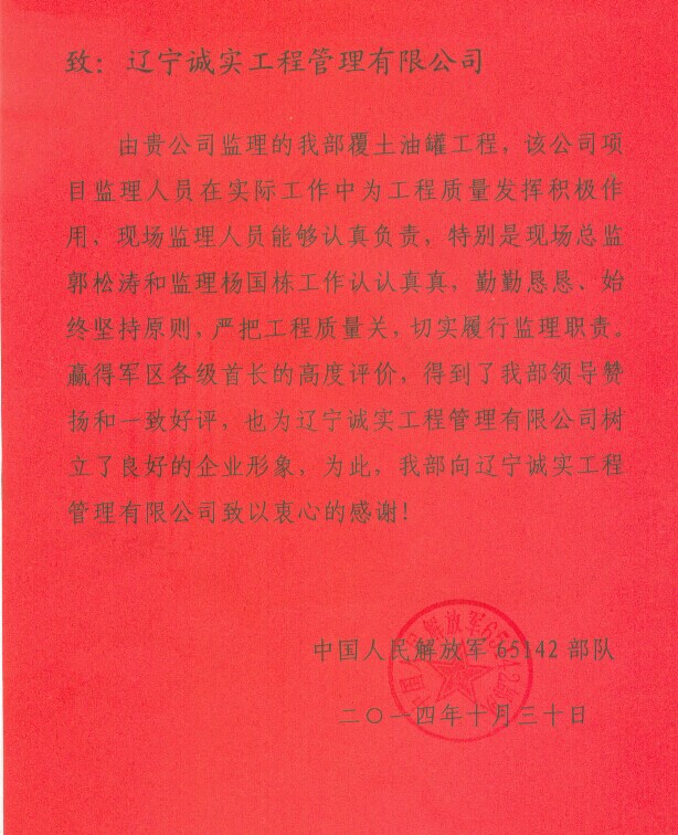 信中,中國人民解放軍65142部隊對我公司及項(xiàng)目監(jiān)理人員表示衷心的感謝。我公司項(xiàng)目監(jiān)理人員能夠認(rèn)真負(fù)責(zé)地工作,切實(shí)履行監(jiān)理職責(zé),并且對該項(xiàng)目的總監(jiān)理工程師郭松濤同志與工程師楊國棟同志提出了表揚(yáng)。為此軍區(qū)各級首長給予了高度評價,得到了65142部隊領(lǐng)導(dǎo)的贊揚(yáng)和一致好評!