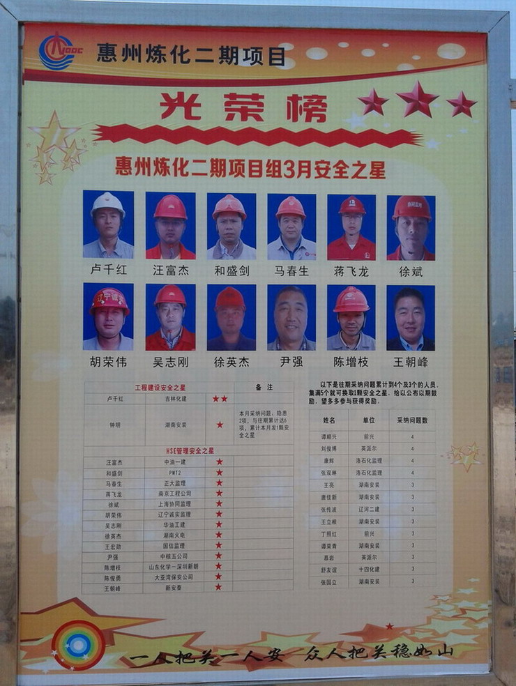 遼寧誠實工程管理有限公司中海石油惠州煉化項目監(jiān)理部HSE監(jiān)理工程師胡榮偉,喜登業(yè)主中海石油煉化公司惠州煉化分公司設(shè)立的三月安全之星光榮榜,體現(xiàn)了中海石油煉化公司惠州煉化分公司對我公司監(jiān)理服務(wù)的信任與認可。
